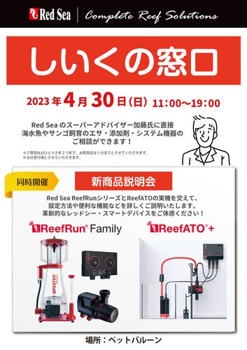 おはようございます 来る 4月30日 日曜日 一日限りの しいくの窓口を 開設いたします。 当日11時から 19時まで レッドシー スーパーアドバイザー 加藤氏が お客様に直接 ご相談を伺ってくれますよ! ルールは ご質問は おひとり様2点まで 水質検査ご希望は…